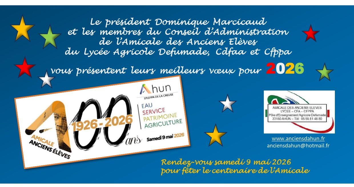 Samedi 9 mai 2026, nous souhaitons partager avec le plus grand nombre d’entre vous, Anciens Elèves et Personnels d’Ahun, un évènement particulier : souffler les 100 bougies de cet anniversaire exceptionnel.
